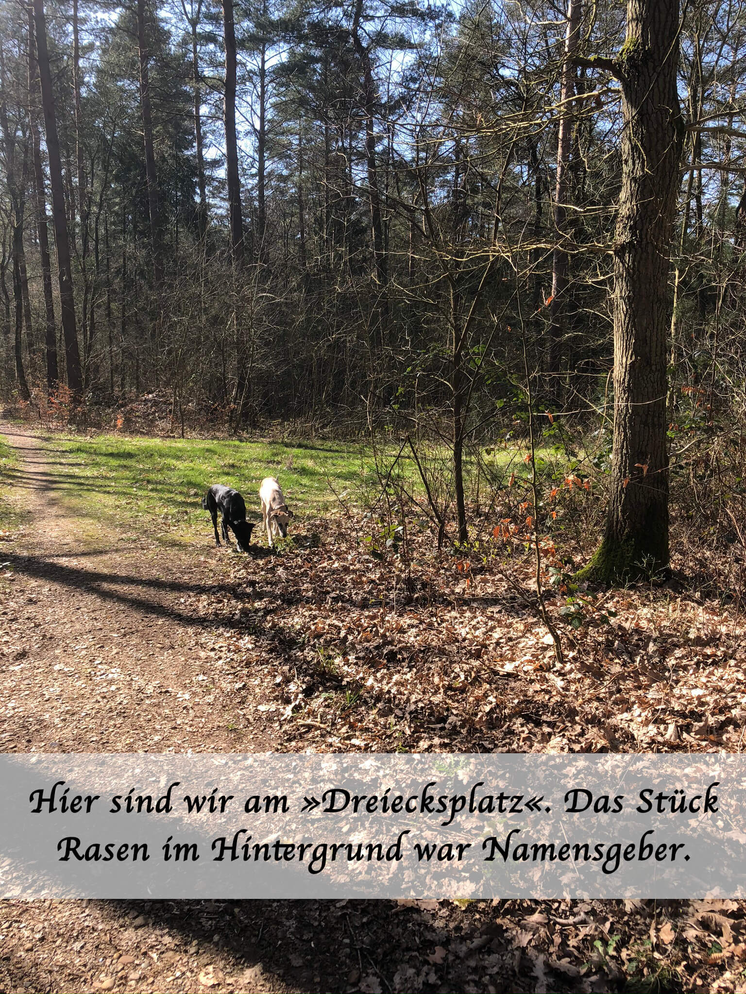 Ich mag diesen Platz sehr. Es ist die einzige kleine Rasenfläche mitten im Wald – und sie hat die Form eines Dreiecks. Im vergangenen Herbst war der gesamte Rasen von Wildschweinen aufgewühlt, inzwischen ist Gras drüber gewachsen.