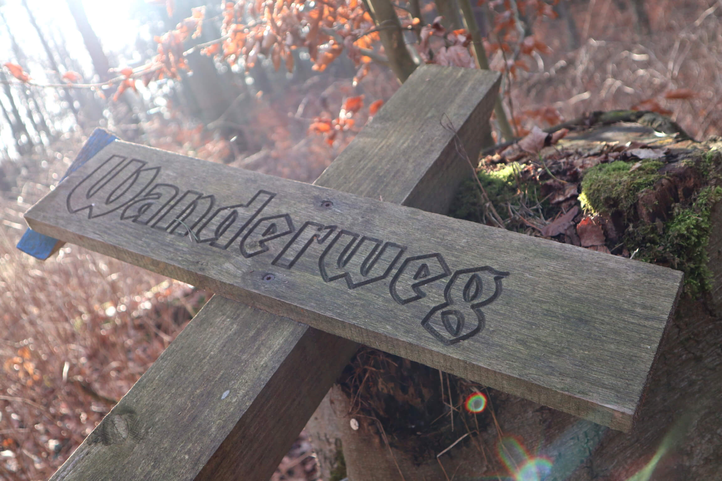 Im ganzen Wald stehen hölzerne Wegweiser, die den Wanderer leiten. Dieses Schild hier steht inzwischen auch wieder. Mir ist schleierhaft, weshalb Menschen im Wald randalieren und Schilder umtreten.