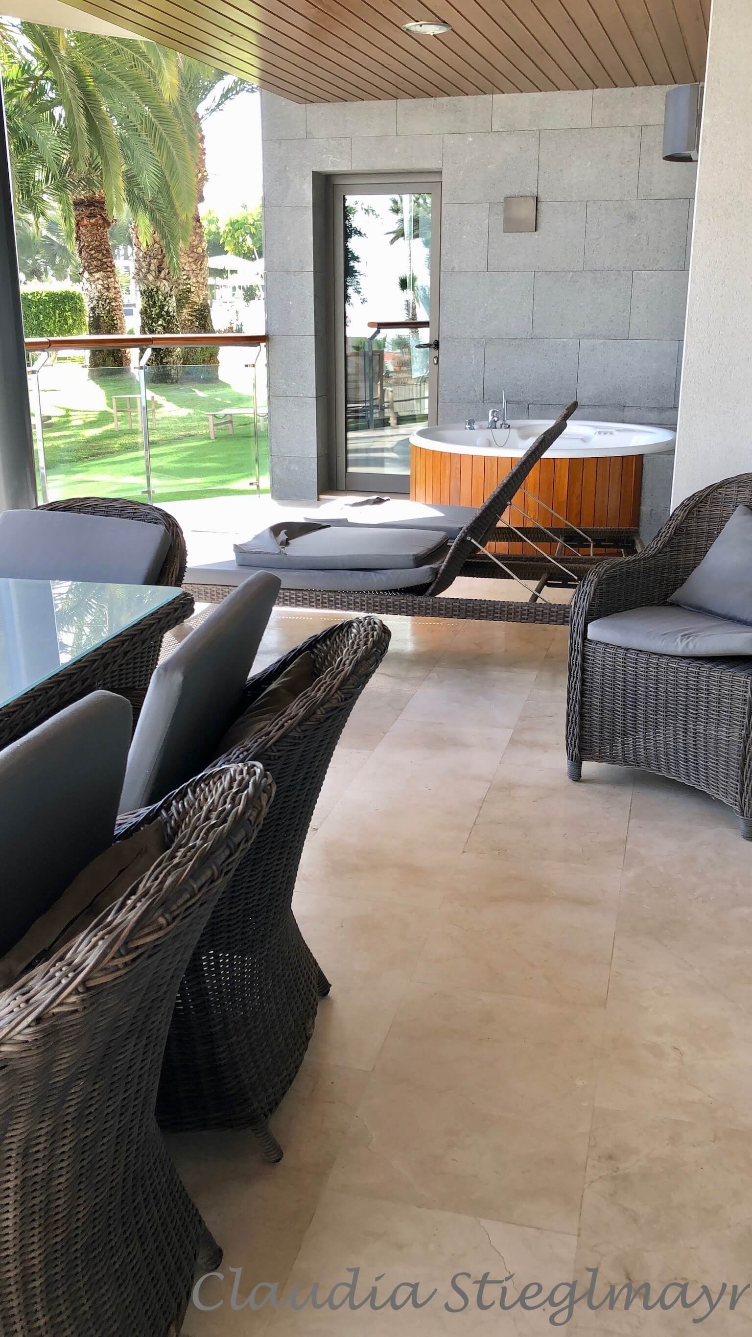 Ich will hier doch nur meine geschundene Seele mit Meeresrauschen und Ruhe heilen. Und mit ein bisschen Alkohol vielleicht, hier gibt es nämlich schon zum Frühstück einen hervorragenden Cava. Den gleichen übrigens, der uns im metallenen Sektkühler – stilecht mit Eiswürfeln – in der Suite begrüßt hat.