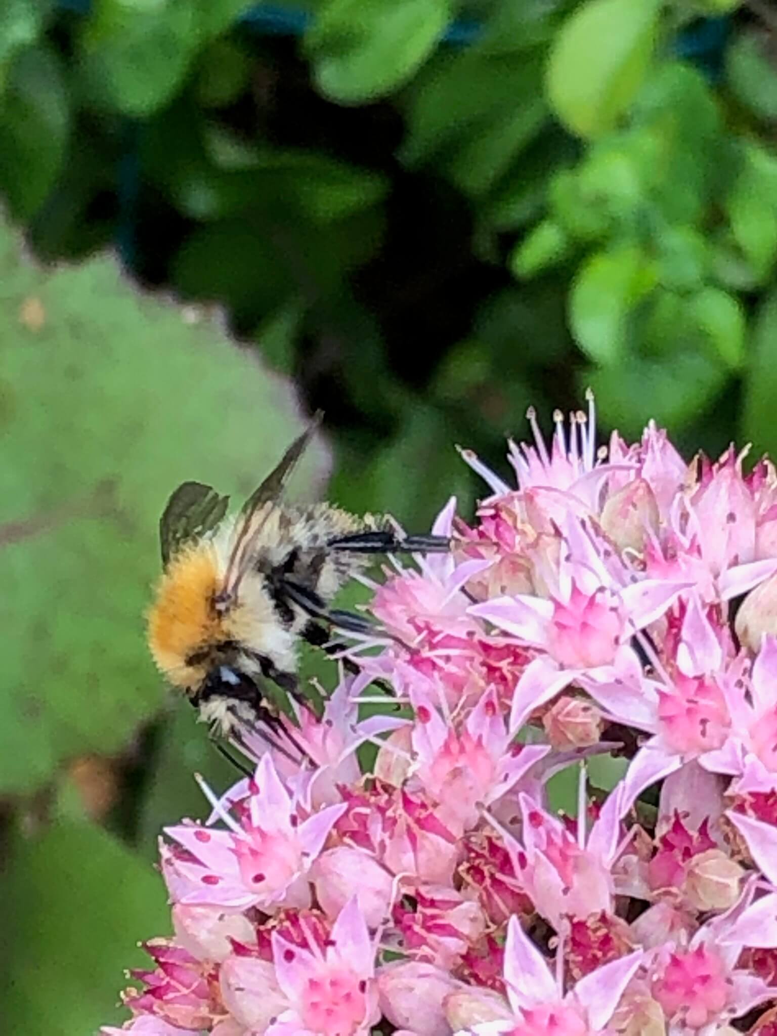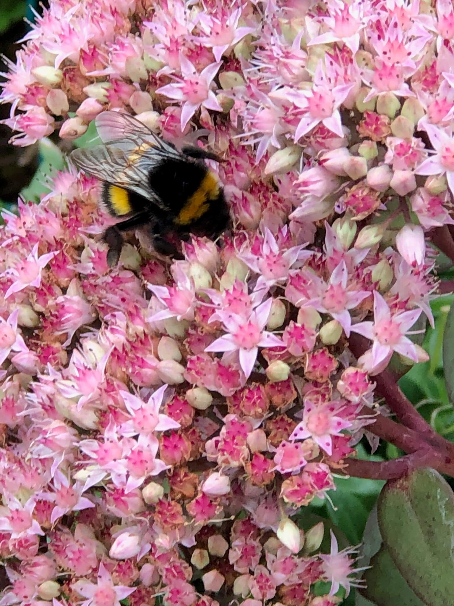 Es ist Herbst geworden in meinem Garten. Und dennoch blüht es dort wie verrückt, Bienen und Hummeln haben hier noch allerlei für ihren Wintervorrat zu sammeln. Vor allem die Fetthenne – botanischer Name: Sedum – hat es ihnen angetan. Das ist eigentlich eine recht unspektakuläre Pflanze, ich habe sie in einem Baumarkt erstanden, weil sie von vielen kleinen Hummeln bevölkert wurde. Diese Staude ist pflegeleicht und erfreut mich jedes Jahr aufs Neue mit ihren vielen kleinen Blüten.