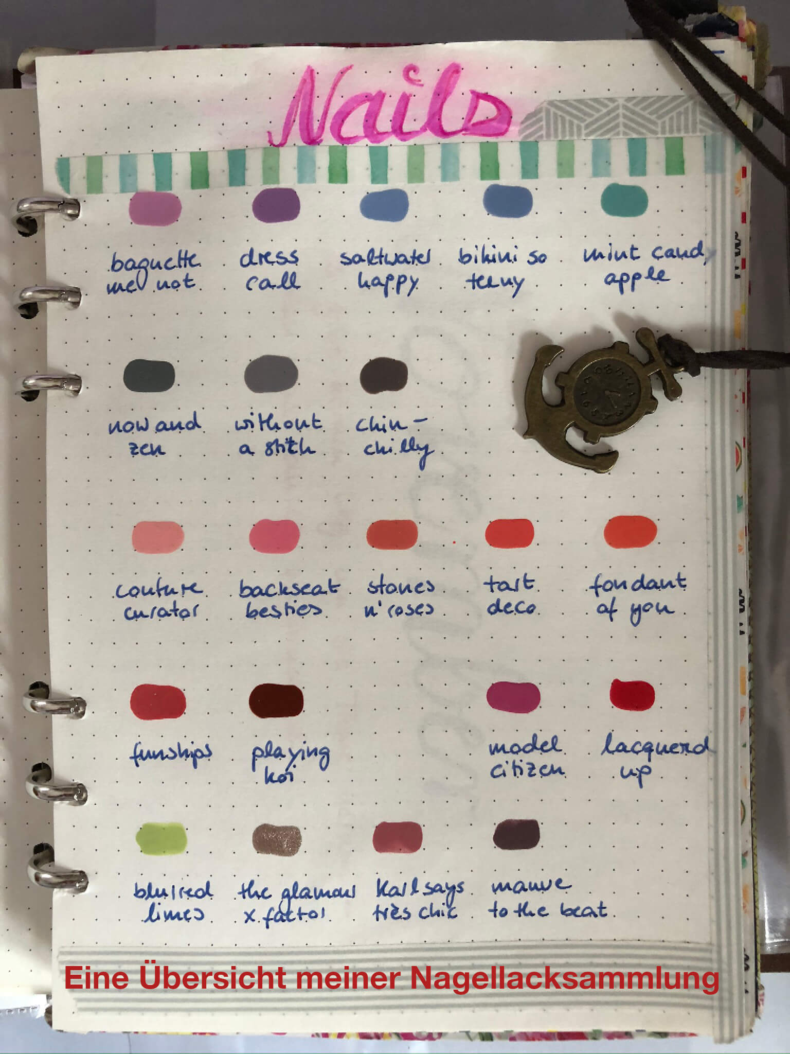 Ich habe es ausprobiert, führe seit anderthalb Jahren ein Bullet Journal und muss sagen: Ich möchte es nicht mehr missen. Anstatt Listen und Post-its und fliegende Zettel mit Terminen zu suchen, kann ich heute sagen: »Moment, ich schau mal nach, das ist alles in meinem BuJo.« Mein gesamtes Leben steckt da drin. Ich habe eine Übersicht meiner Nagellacke (s.o.), meiner Versicherungen, Öffnungszeiten von Läden, die ich sonst x-mal nachschlagen muss. Außerdem Geburtstage, einen Regelkalender, einen Putzplan, Abgabetermine für mein Lektorat, eine Extra-Seite mit besonderen Events, eine Liste mit Fragen für den Elternsprechtag, eine Ideen-Seite für diesen Blog, eine Übersicht über getrunkenes Wasser…